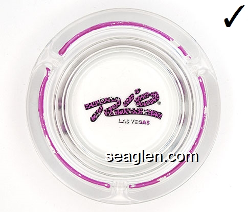 RIV-Q1 Riviera Hotel Las Vegas, NV 3 9/16" Amethyst Glass Ashtray White imprint: Riviera Las Vegas, Splash ... An Aquacade of Music & Dance, An Evening at La Cage (Like RIV-07, except smooth bottom) |