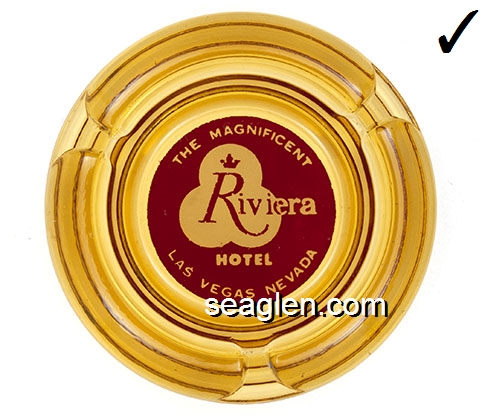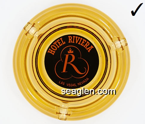 RIV-D1 Riviera Hotel Las Vegas, NV 4" Light Amber Glass Ashtray Red on white imprint: The Magnificent Riviera Hotel, Las Vegas, Nevada (Like RIV-04, except amber glass. Rounded sniffers.) |