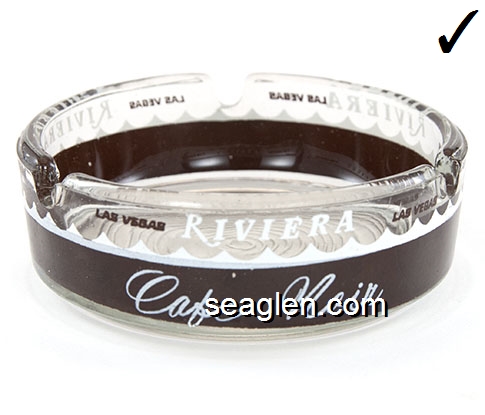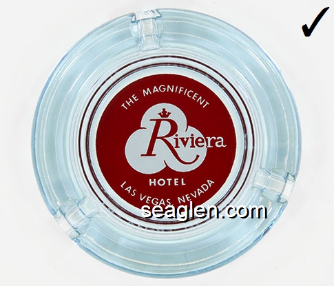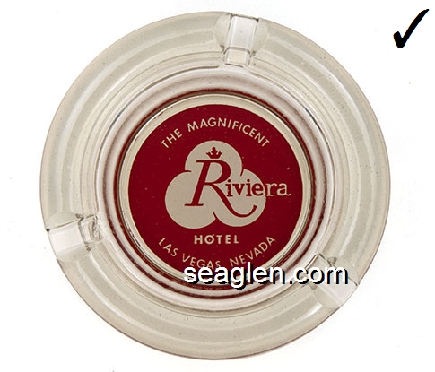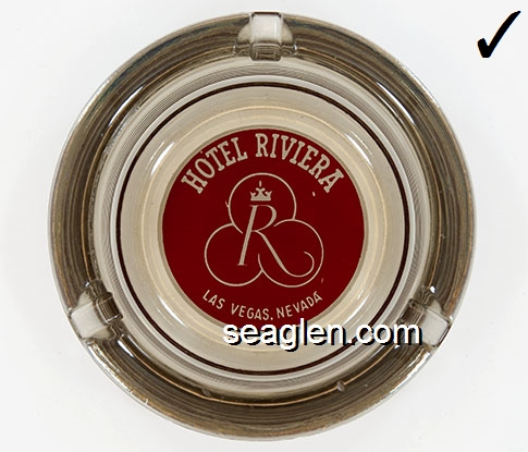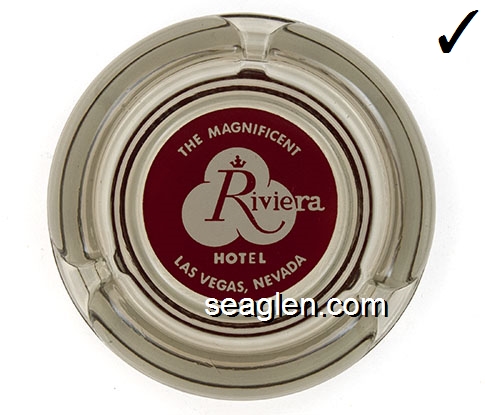 RIV-04 Riviera Hotel Las Vegas, NV 4" Smoke Glass Ashtray Red and white imprint: The Magnificent Riviera Hotel, Las Vegas, Nevada |
