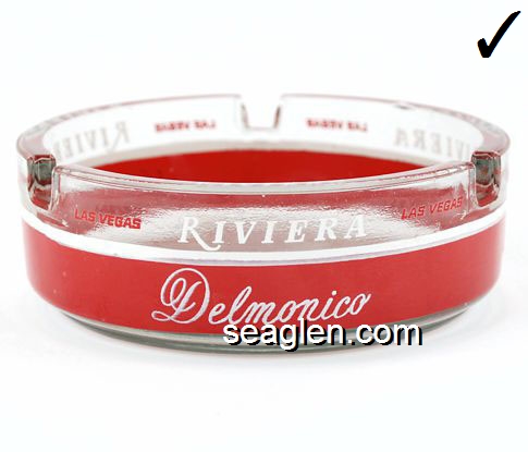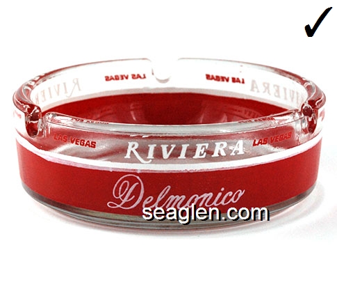 RIV-E3 Riviera Hotel Las Vegas, NV 3 1/2" Clear Glass Ashtray White on red and green imprint: Las Vegas Riviera Nevada, Lighthouse, Ristorante Italiano, Delmonico (Like RIV-10, except imprint is white on red and green.) |