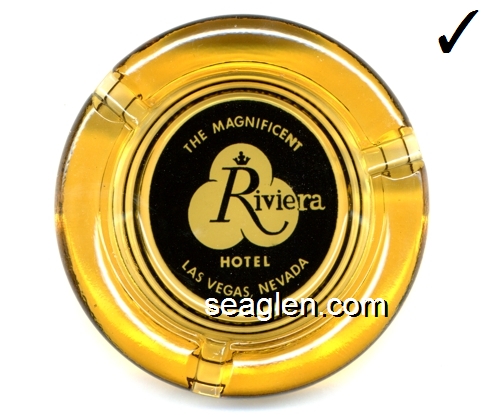 RIV-B4 Riviera Hotel Las Vegas, NV 4" Amber Glass Ashtray Black on white imprint: The Magnificent Riviera Hotel, Las Vegas, Nevada (Straight sniffers) |