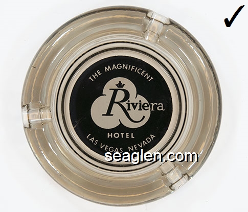 RIV-B1 Riviera Hotel Las Vegas, NV 4" Smoke Glass Ashtray Red on white imprint: The Magnificent Riviera Hotel, Las Vegas, Nevada (Like RIV-04, except with straight sniffers) |