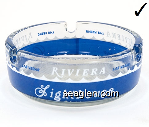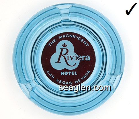 RIV-D3 Riviera Hotel Las Vegas, NV 4" Blue Glass Ashtray Red on white imprint: The Magnificent Riviera Hotel, Las Vegas, Nevada (Rounded sniffers) |