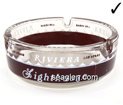 RIV-E1 Riviera Hotel Las Vegas, NV 3 1/2" Clear Glass Ashtray Maroon and white imprint: Las Vegas Riviera Las Vegas, Delmonico, Cafe Noir, Lighthouse (Like RIV-10, except maroon imprint with white peaks) |