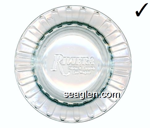 RIV-J2 Riviera Hotel Las Vegas, NV 4 1/2" Clear Glass Ashtray Molded imprint: Riviera Hotel & Casino, Las Vegas (Like RIV-14, except clear color. USA moulded under side) |
