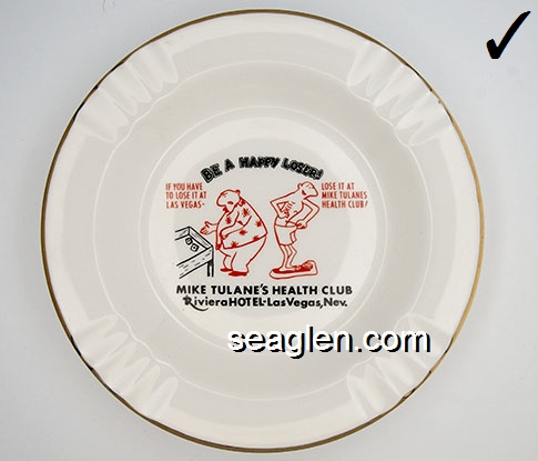 RIV-N2 Riviera Hotel Las Vegas, NV 7 3/4" White Porcelain Ashtray Black and red imprint: Be a Happy Loser!, If You Have To Lose It at Las Vegas - Lose It ... T., Mike Tulane's Health Club, Riviera Hotel - Las Vegas, Nev. |