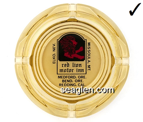 RLM-A1 Red Lion Motor Inn Elko, NV 4 1/2" Amber Glass Ashtray Red and black on white imprint: Red Lion Motor Inn, Elko, Nev., Missoula, Mt., Medford, Ore., Bend, Ore., Redding, Cal. |