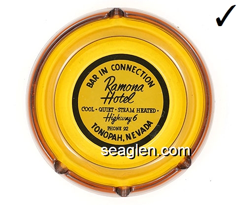 RMA-B1 Ramona Hotel Tonopah, NV 4" Amber Glass Ashtray Black on white imprint: Bar in Connection, Ramona Hotel, Cool - Quiet - Steam Heated -, Highway 6, Phone 92, Tonopah, Nevada |