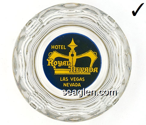 RNV-B1 Royal Nevada Las Vegas, NV 5" Clear Glass Ashtray Yellow on red imprint: Home of the Dancing Waters, Hotel Royal Nevada, Las Vegas, Nevada (SAFEX style) |