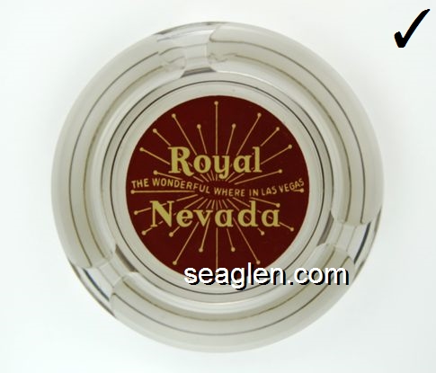 RNV-A1 Royal Nevada Las Vegas, NV 4" Smoke Glass Ashtray White on red imprint: Royal Nevada, The Wonderful Where in Las Vegas (Like RNV-01, except with white on red imprint; thin border) |