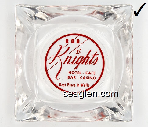 ROD-A1 Rod Knight's Wagon Wheel Wells, NV 3 1/2" Clear Glass Ashtray Red imprint: Rod Knight's Hotel - Cafe Bar - Casino, Best Place in Wells |