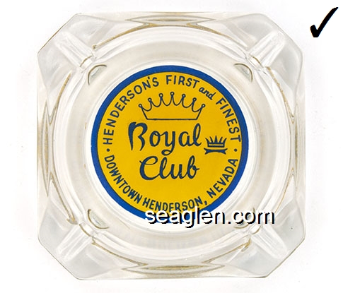 ROY-02 Royal Club Henderson, NV 3 1/2" Clear Glass Ashtray Blue on yellow imprint: Henderson's First and Finest, Royal Club, Downtown Henderson, Nevada |
