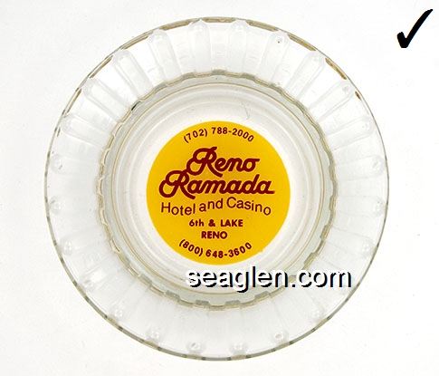RRH-A2 Reno Ramada Hotel and Casino Reno, NV 4 1/2" Amber Glass Ashtray Red on yellow imprint: (702) 788-2000 Reno Ramada, Hotel Casino, 6th & Lake Downtown Reno, (800) 648-3600 |