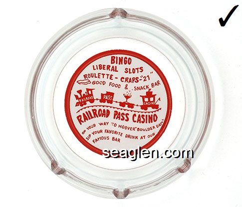 RRP-02 Railroad Pass Casino Boulder City, NV 4" Clear Glass Ashtray Red on white imprint: Bingo, Liberal Slots, Roulette - Craps - ''21'', Good Food & ... ''Boulder Dam'' Sip Your Favorite Drink at Our Famous Bar |