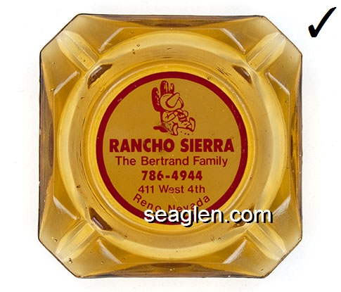 RSM-A2 Rancho Sierra Motel Reno, NV 3 1/2" Amber Glass Ashtray Red on white imprint: Rancho Sierra, The Bertrand Family, 786-4944, 411 West 4th, Reno, Nevada (Style "C") |