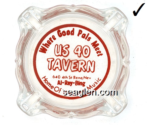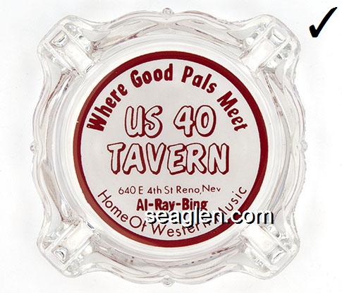 UST-91 US 40 Tavern Reno, NV 4" Clear Glass Ashtray Red silkscreen imprint: Where Good Pals Meet, US 40 Tavern, 640 E. 4th St. Reno, Nev., Al - Ray - Bing, Home of Western Music (A silk screened fake, sold on eBay by seller greencOkecollector) |