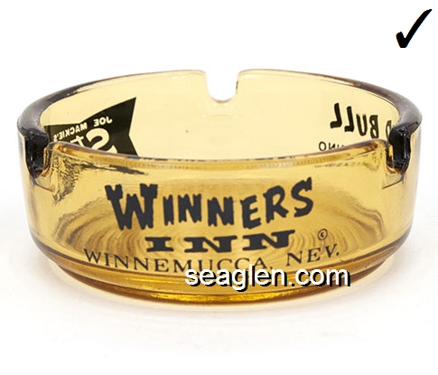 SJM-10 Winners Inn/ Winners Hotel-Casino Winnemucca, NV 3 1/2" Amber Glass Ashtray Black imprint: Winners Inn, Winnemucca, Nev., Red Bull Restaurant & Casino, Joe Mackie's Star, Winnemucca |