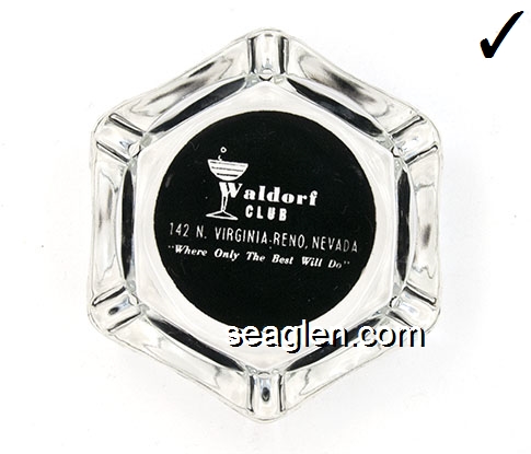 WAL-01 Waldorf Club Reno, NV 3 1/4" Clear Glass Ashtray Clear through black imprint: Waldorf Club, 142 N. Virginia - Reno, Nevada, ''Where Only The Best Will Do'' |