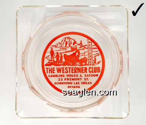 WES-02 Westerner Club Las Vegas, NV 4 1/4" Clear Glass Ashtray Red on white imprint: The Westerner Club, Gambling House & Saloon, 23 Fremont St. Downtown Las Vegas, Nevada |