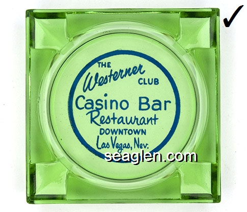 WES-B2 Westerner Club Las Vegas, NV 3 1/2" Green Glass Ashtray Blue imprint: The Westerner Club Casino Bar Restaurant, Downtown Las Vegas, Nev. (Like WES-04, except green glass) |