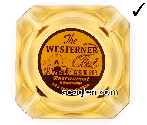 WES-C1 Westerner Club Las Vegas, NV 3 1/2" Amber Glass Ashtray Brown and yellow imprint: The Westerner Club Casino Bar, Restaurant Downtown Las Vegas, Nevada (Like WES-06, except amber glass) |