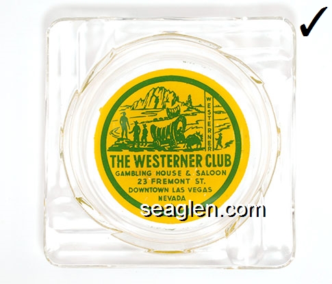 WES-F1 Westerner Club Las Vegas, NV 4 1/4" Clear Glass Ashtray Green on yellow imprint: The Westerner Club, Gambling House & Saloon, 23 Fremont St., Downtown Las Vegas, Nevada |