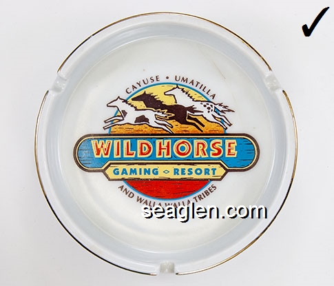 WHC-B1 Wildhorse Resort & Casino Pendleton, OR 4 5/8" White Porcelain Ashtray Multi imprint: Cayuse - Umatilla, Wildhorse, Gaming - Resort, and Walla Walla Tribes |