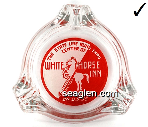 WHI-B1 White Horse Inn McDermitt, NV 3 1/2" Clear Glass Ashtray Red on white imprint: The State Line Runs Thru Center of White Horse Inn, Oregon, Nevada, McDermitt, On U.S. 95 |