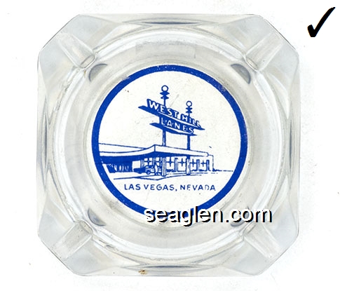 WHL-B1 Westhill Lanes Las Vegas, NV 3 1/2" Clear Glass Ashtray Blue imprint: West Hill Lanes, Las Vegas, Nevada |
