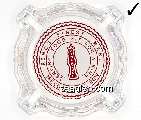 WIH-03 Wine House Reno, NV 3 11/16" Clear Glass Ashtray Red on white imprint: Reno's Finest Menu, Serving Food Fit For a King, Wine House, 18 E. Commercial Row |