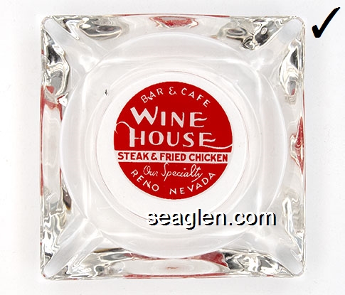 WIH-B1 Wine House Reno, NV 3 1/2" Clear Glass Ashtray White on red imprint: Wine House, Bar & Cafe, Reno Nevada, Our Specialty Steaks & Fried Chicken |