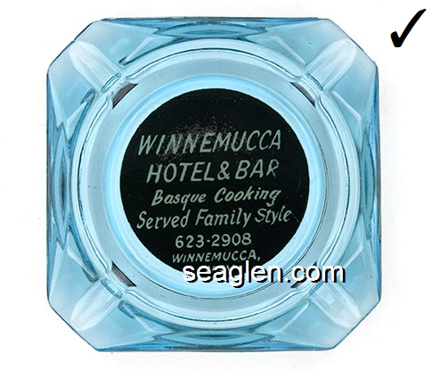 WNH-B1 Winnemucca Hotel Winnemucca, NV 3 1/2" Blue Glass Ashtray White on black imprint: Winnemucca Hotel & Bar, Basque Cooking Served Family Style, 623-2908, Winnemucca, Nev. |