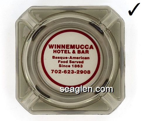 WNH-C1 Winnemucca Hotel Winnemucca, NV 3 1/2" Smoke Glass Ashtray Red imprint: Winnemucca Hotel & Bar, Basque-American Food Served Since 1863, 702-623-2908 |