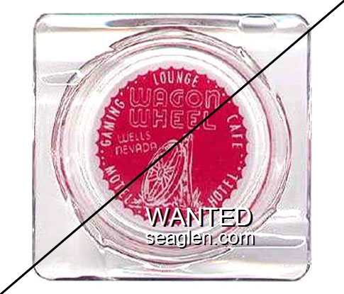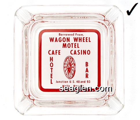 WWC-A1 Wagon Wheel Motel-Casino Wells, NV 4 1/8" Clear Glass Ashtray Red on white imprint: Borrowed From, Wagon Wheel Motel Cafe Casino, Hotel, Bar, Junction U.S. 40 and 93, Wells, Nevada |