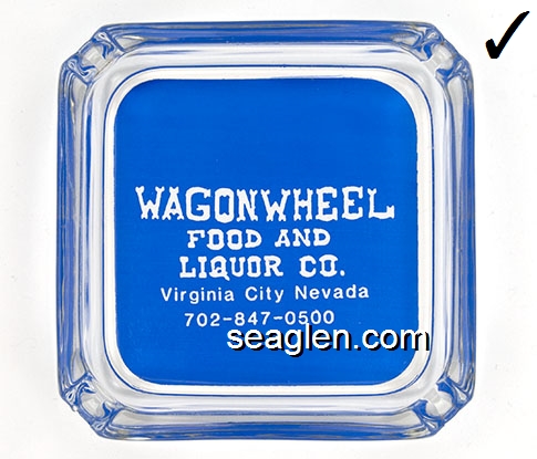 WWF-A1 Wagon Wheel Food and Liquor Virginia City, NV 3 11/16" Clear Glass Ashtray Clear thru blue imprint: Wagon Wheel Food and Liquor Co., Virginia City Nevada, 702-847-0500 |