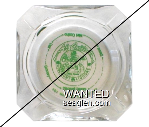ALC-A1 Al Collins Discount Liquors 3 1/2" Clear Glass Ashtray "Al Collins Discount Liquors, 501 West 4th Reno Nevada, Discount Liquors, Grocery, Deli, Mini Casino, Diesel" - Green on white |