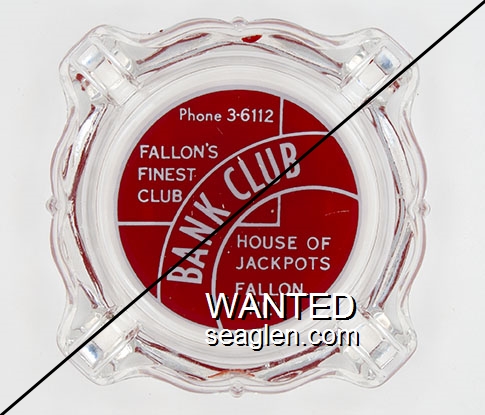 BAN-10 Bank Club (Fallon) 3 11/16" Clear Glass Ashtray "Phone 3-6112, Fallon's Finest Club, Bank Club, House of Jackpots, Fallon, Nev." - Red on white |