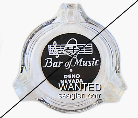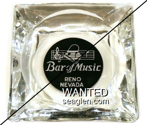 BMR-B1 Bar of Music (Reno) 3 1/2" Clear Glass Ashtray "Bar of Music, Reno Nevada" - White on black |