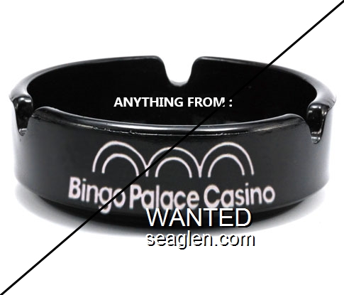 BPC-A1 Bingo Palace Casino 3 1/2" Amethyst Glass Ashtray "Bingo Palace Casino" - White (Ashtray displayed is a fantasy created in Photoshop.) |