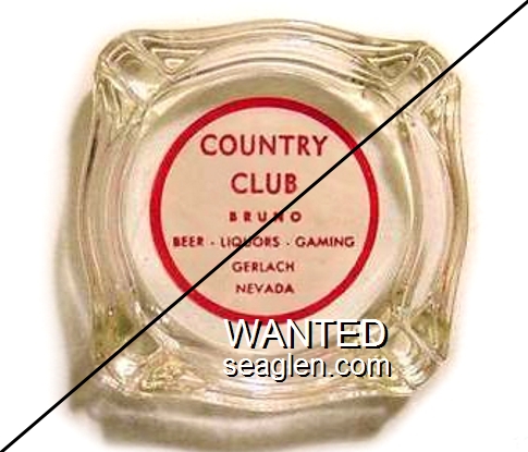 BRU-B1 Bruno's Country Club 3 7/16" Clear Glass Ashtray "Country Club, Bruno, Beer - Liquors - Gaming, Gerlach Nevada" - Red on white |