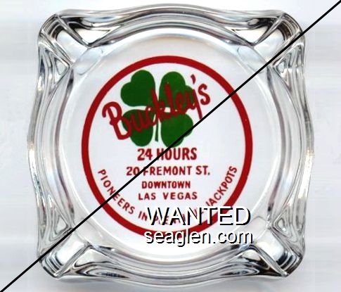 BUC-A1 Buckley's Jackpot Club 3 7/16" Clear Glass Ashtray "Buckley's, 24 Hours, 20 Fremont St., Downtown Las Vegas, Pioneers in Plentiful Jackpots" - Red and green on white |