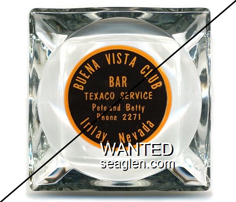 BVC-B1 Buena Vista Club 3 1/2" Clear Glass Ashtray "Buena Vista Club Bar, Texaco Service, Pete and Betty, Phone 2271, Imlay, Nevada" - Orange on black |