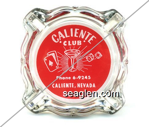 CAL-B1 Caliente Club 3 11/16" Clear Glass Ashtray "Caliente Club, Phone 6-9245, Caliente, Nevada" - White on red |