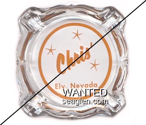 CHR-A1 Chris' Lounge 3 11/16" Clear Glass Ashtray "Chris' Ely, Nevada" - Orange on white |