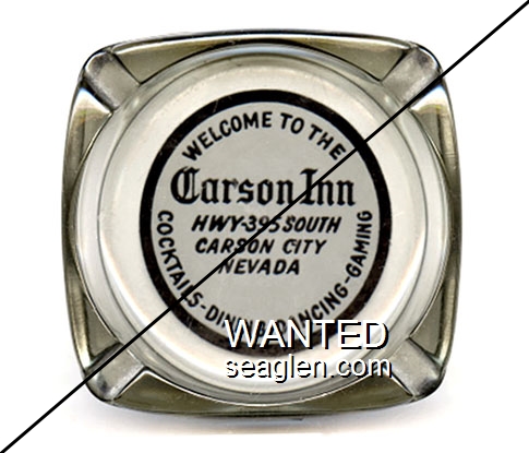 CIC-A1 Carson Inn 3 1/4" Smoke Glass Ashtray "Welcome to the Carson Inn, Hwy-395 South Carson City Nevada, Cocktails - Dining - Dancing - Gaming" - Black on white |