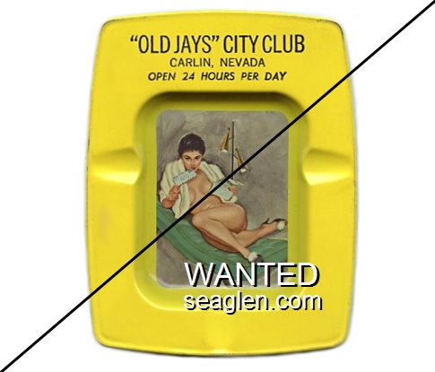CIT-A1 City Club 3 3/4 x 4 3/4" Yellow Metal Ashtray "''Old Jays'' City Club, Carlin, Nevada, Open 24 Hours Per Day" - Black |