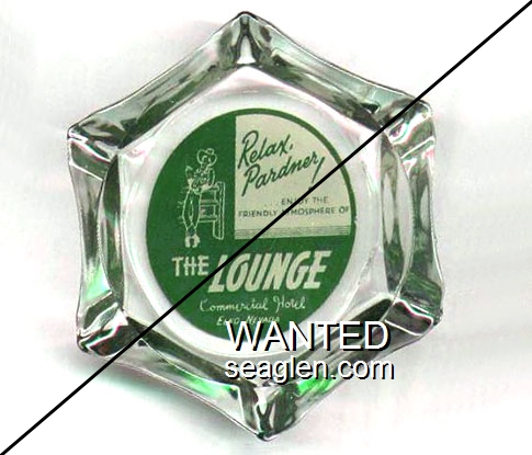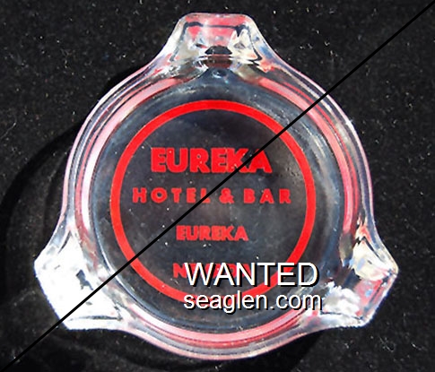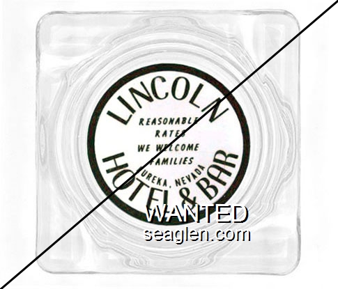 LHB-02 Lincoln Hotel & Bar 4 3/16" Clear Glass Ashtray "Lincoln Hotel & Bar, Reasonable Rates, We Welcome Families, Eureka, Nevada" - Black on white |