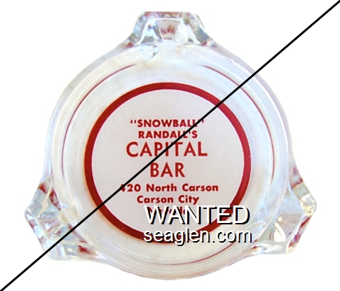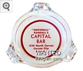 CPB-C1 Capital Bar 3 1/4" Clear Glass Ashtray "''Snowball'' Randall's Capital Bar, 420 North Carson, Carson City, Nevada" - Red on white |