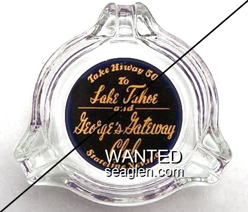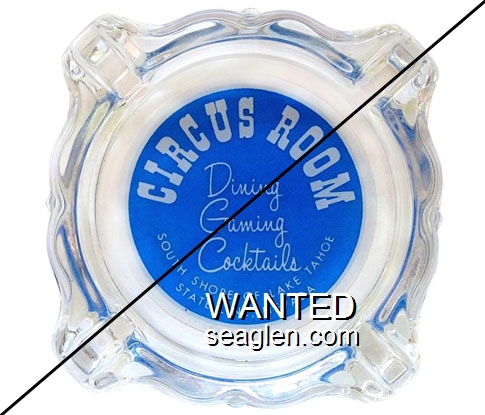 CRM-A1 Circus Room 3 11/16" Clear Glass Ashtray "Circus Room, Dining, Gaming, Cocktails, South Shore of Lake Tahoe, State Line, Nevada" - White on blue |