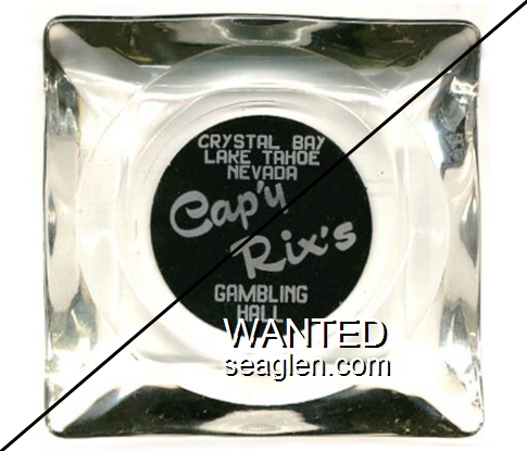 CRX-A1 Capy Rix's Gaming Hall 3 1/2" Clear Glass Ashtray "Crystal Bay, Lake Tahoe, Nevada, Cap'y Rix's Gambling Hall" - White on black |